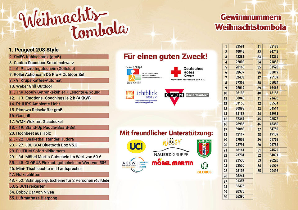 Heute, den 8. Januar fand die Ziehung unserer Tombola-Lose im Globus statt – organisiert durch den DRK-Kreisverband Kaiserslautern Stadt e.V. in Zusammenarbeit mit Lichtblick 2000 e.V. (Förder- und Wohltätigkeitsverein für Kinder und Jugendliche), Mama/ Papa hat Krebs e. V., Christlicher Verein Junger Menschen (CVJM) Kaiserslautern e. V. und Globus Kaiserslautern.